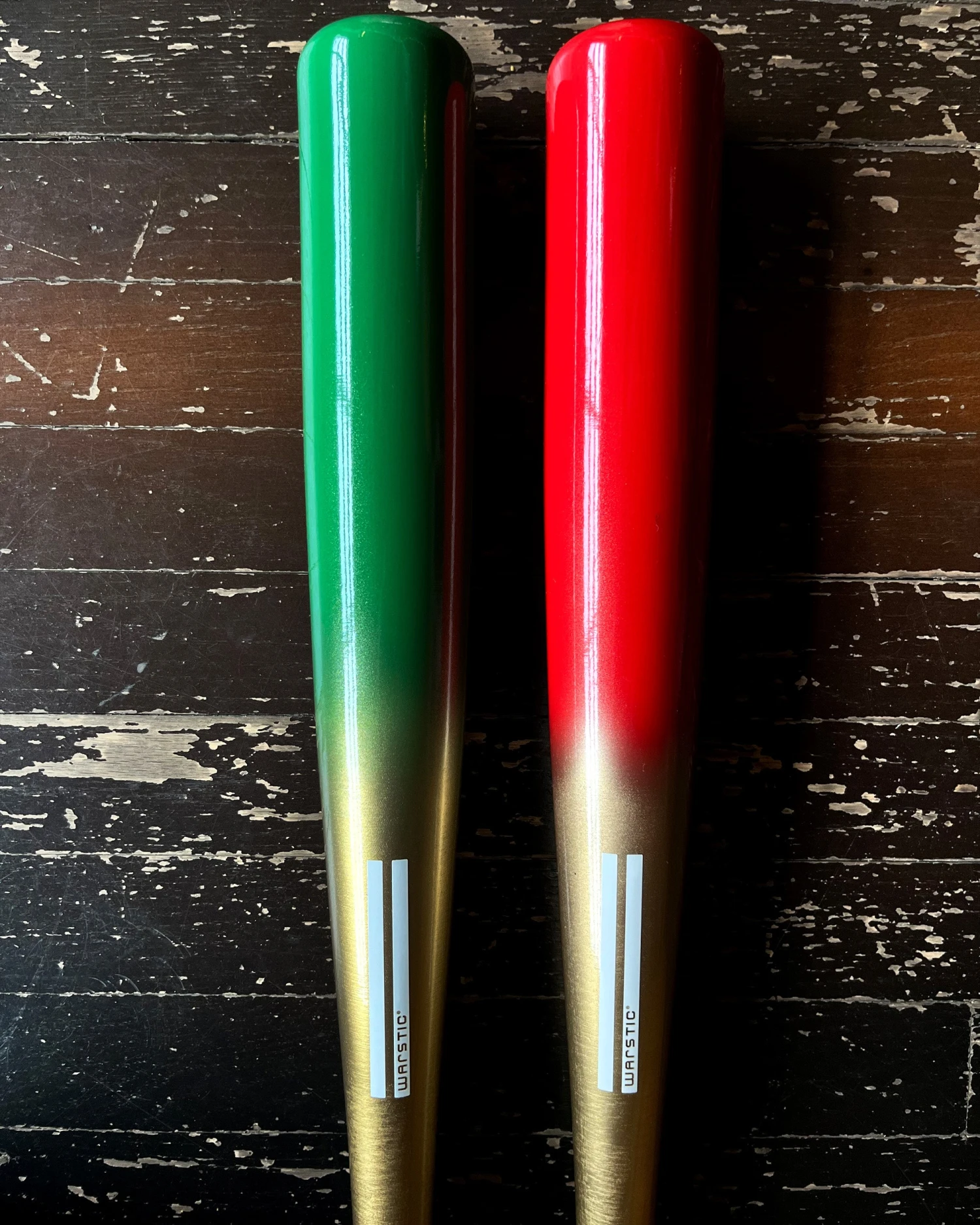 This Small Batch Rudolph WS271 Wood Bat shines with a bright apple red barrel, metallic gold fade down the handle and is equipped with a candy coated high shine finish. Made with Ink Dot grade wood this bat may shine like a glass ornament but has the strength of the same wood our pros use. Order before 2pm 12/21 and select overnight shipping to receive in time for Christmas!