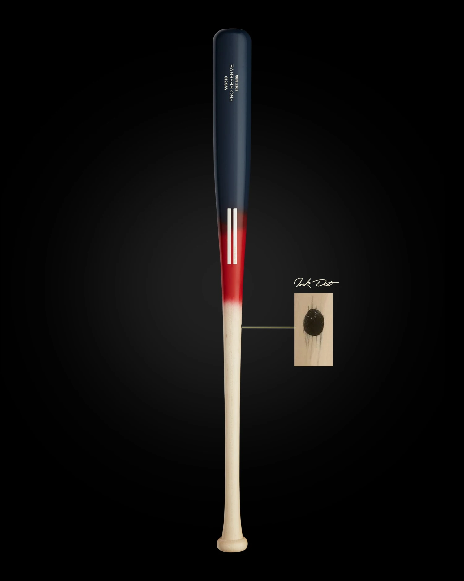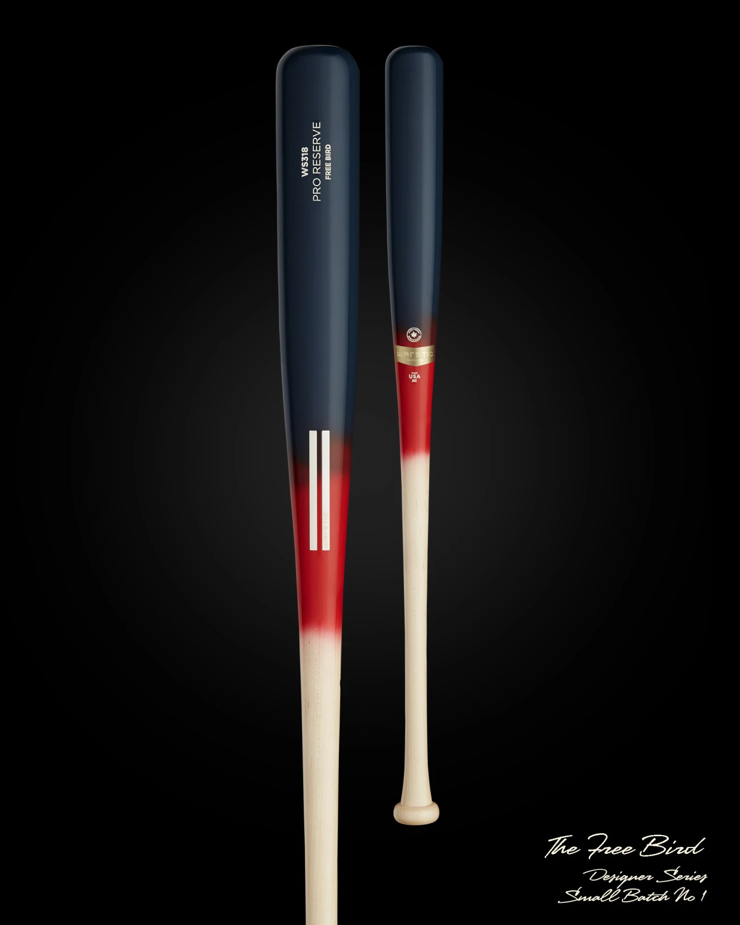 The Free Bird by Warstic features a royal half-dip barrel, blood mid-fade and natural handle, with white Warstripe logo and engraving. Cut from our Pro Reserve stock of maple, as indicated by the “Ink Dot” on the handle. As part of the exclusive, small batch release, “Free Bird” is engraved on the barrel of the bat.